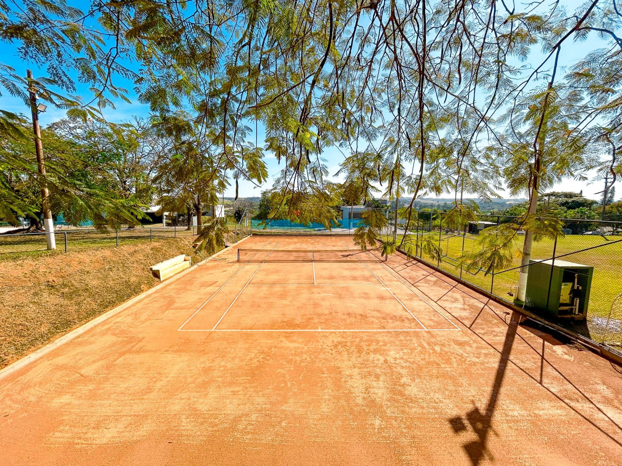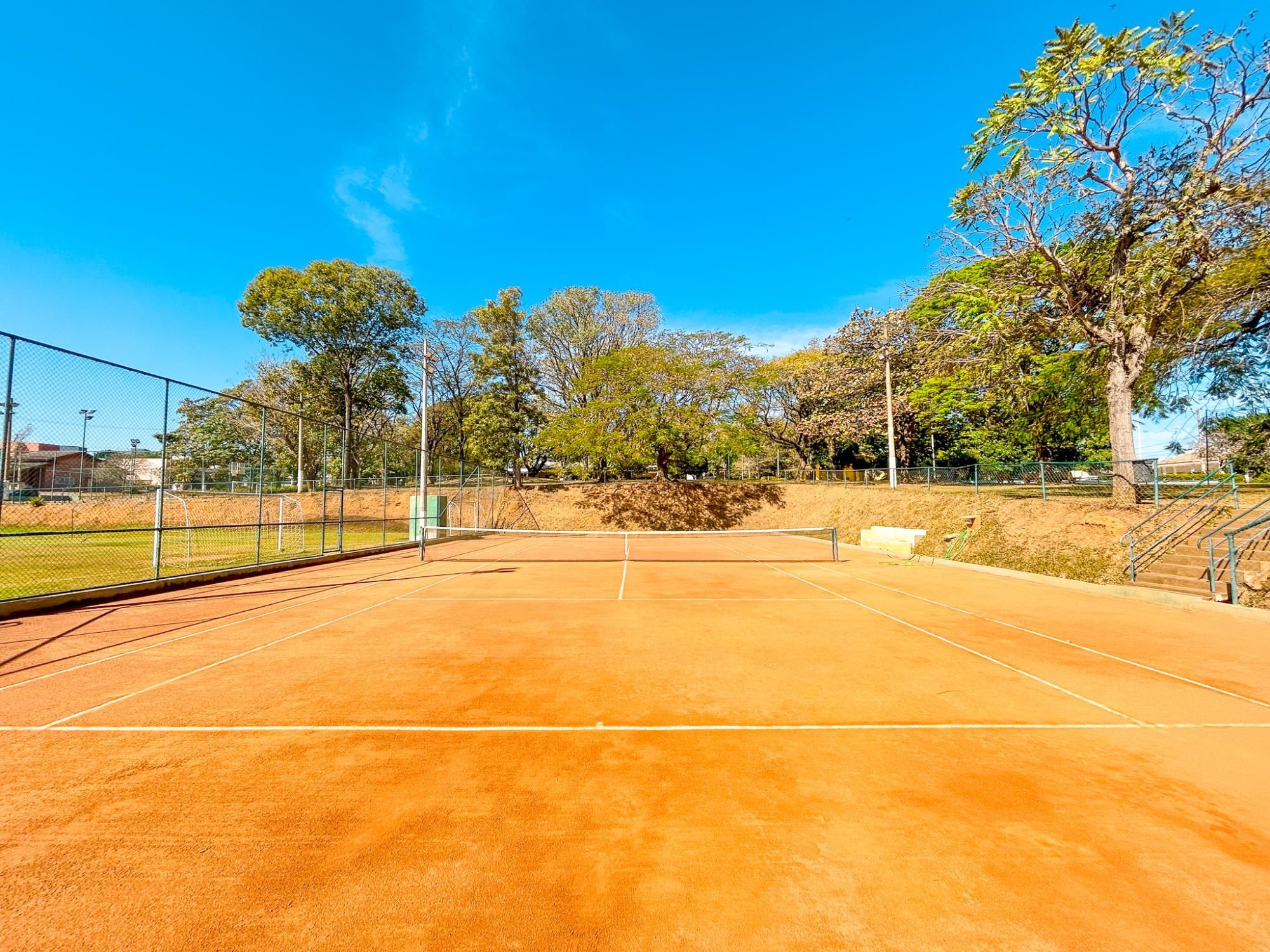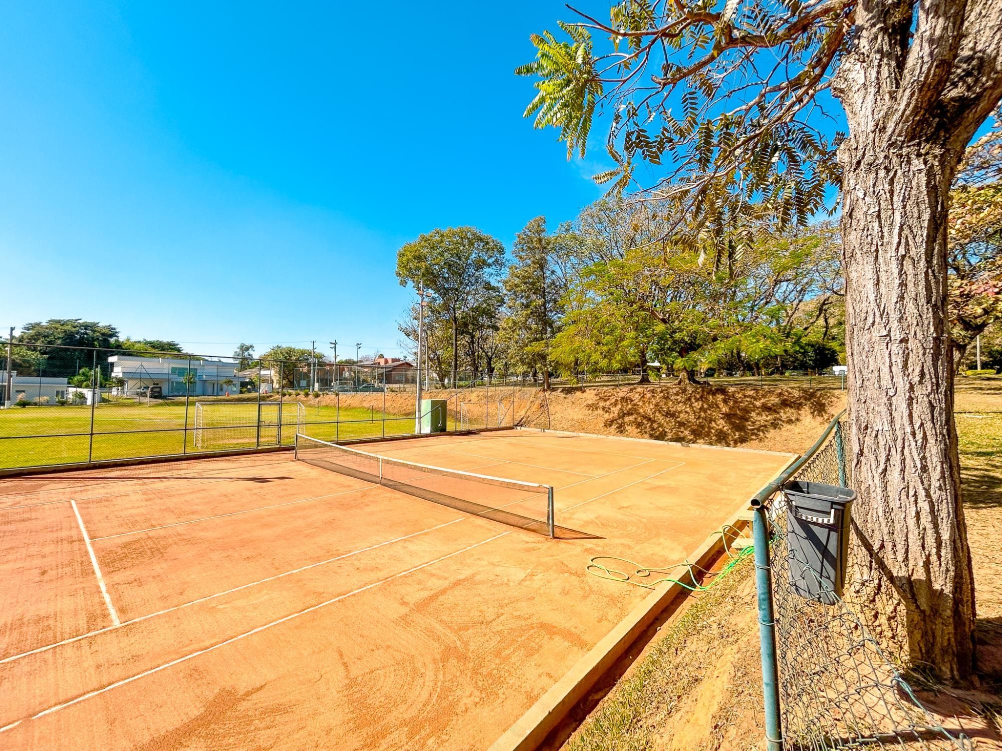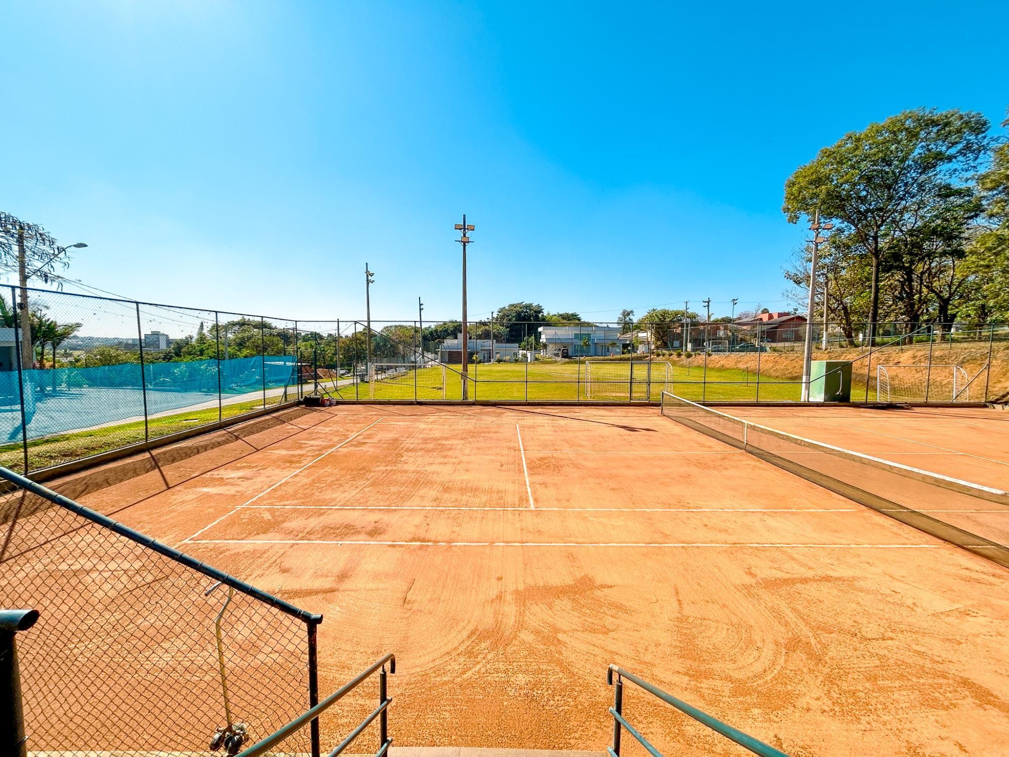 - Quadra de tênis de saibro, quadra poliesportiva e campo de futebol